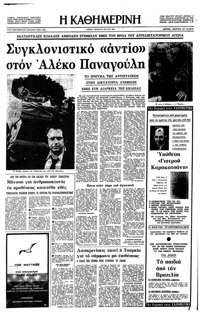 6.5.1976. Η πάνδημη κηδεία του Αλέκου Παναγούλη καλύπτει σχεδόν ολόκληρη την πρώτη σελίδα της «Κ».