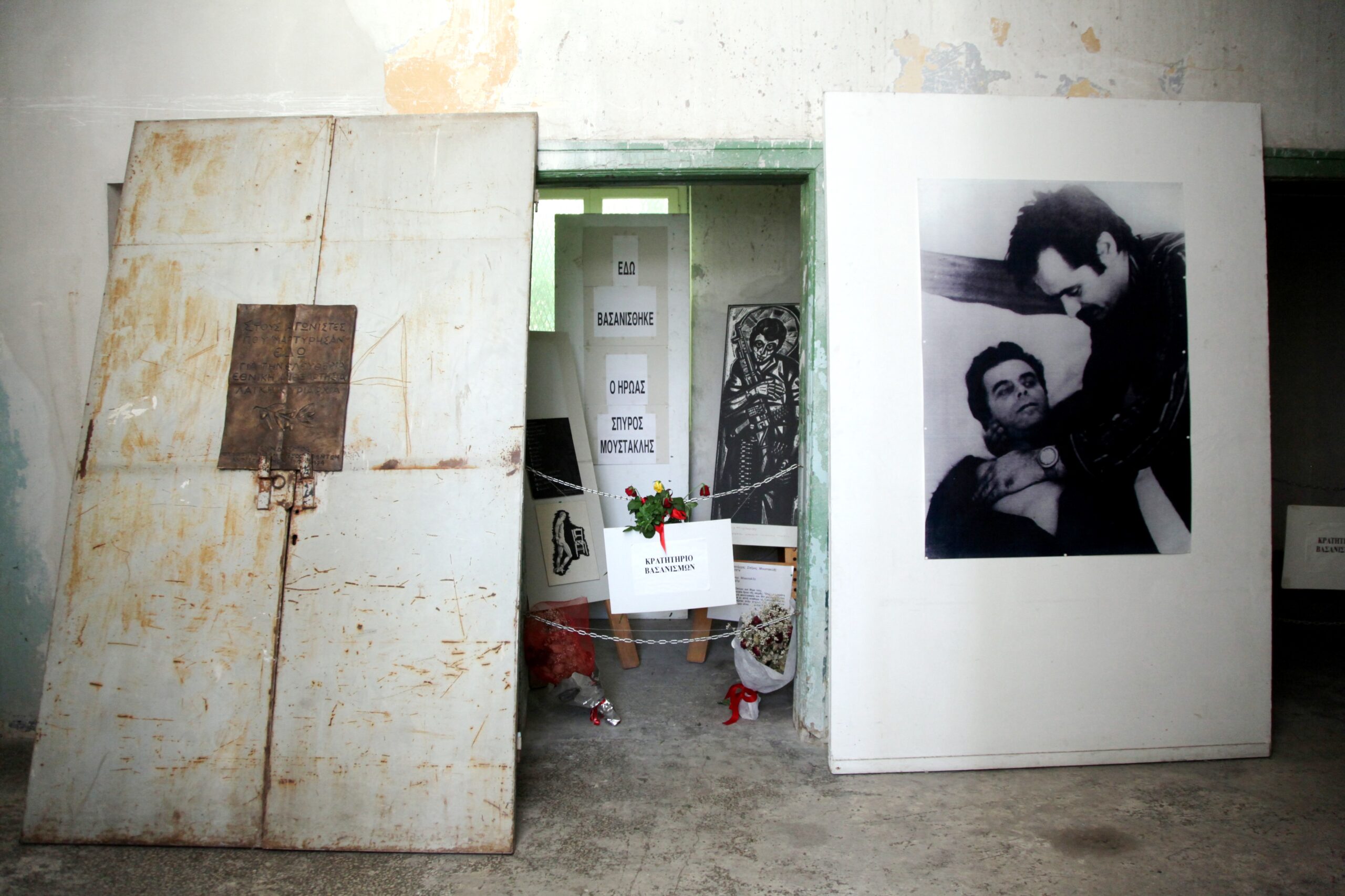 Το κρατητήριο στο οποίο βασανίστηκε ο Σπύρος Μουστακλής (ΕΑΤ-ΕΣΑ). Σε άλλο κρατητήριο, στο ίδιο κτίριο, είχε βασανιστεί και ο Παναγούλης. Δεξιά, η πασίγνωστη φωτογραφία με την επίσκεψη του Αλέκου Παναγούλη στον Μουστακλή στην Πολυκλινική τον Σεπτέμβριο του 1973. Eurokinissi