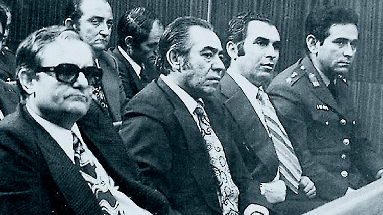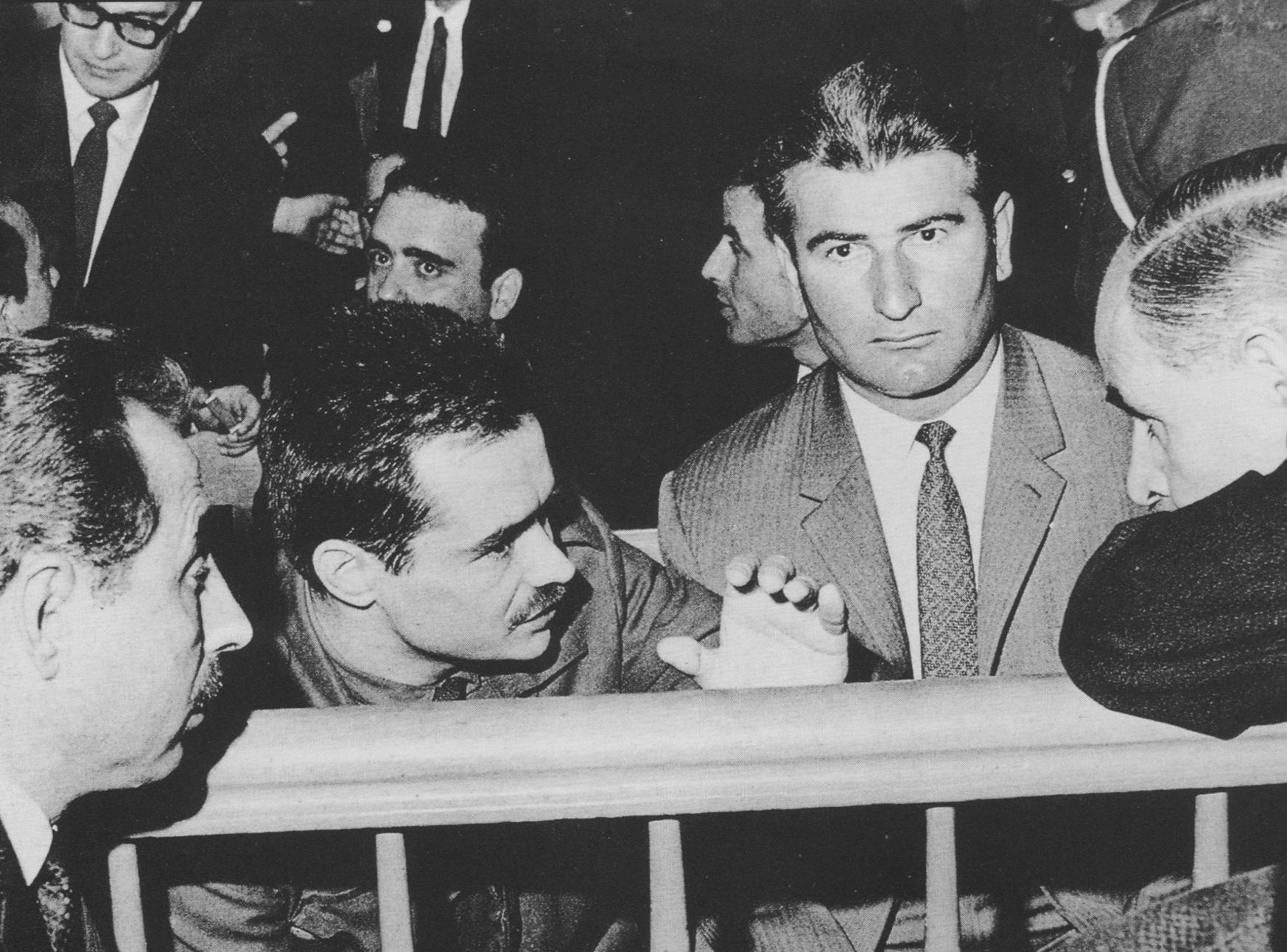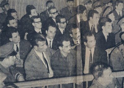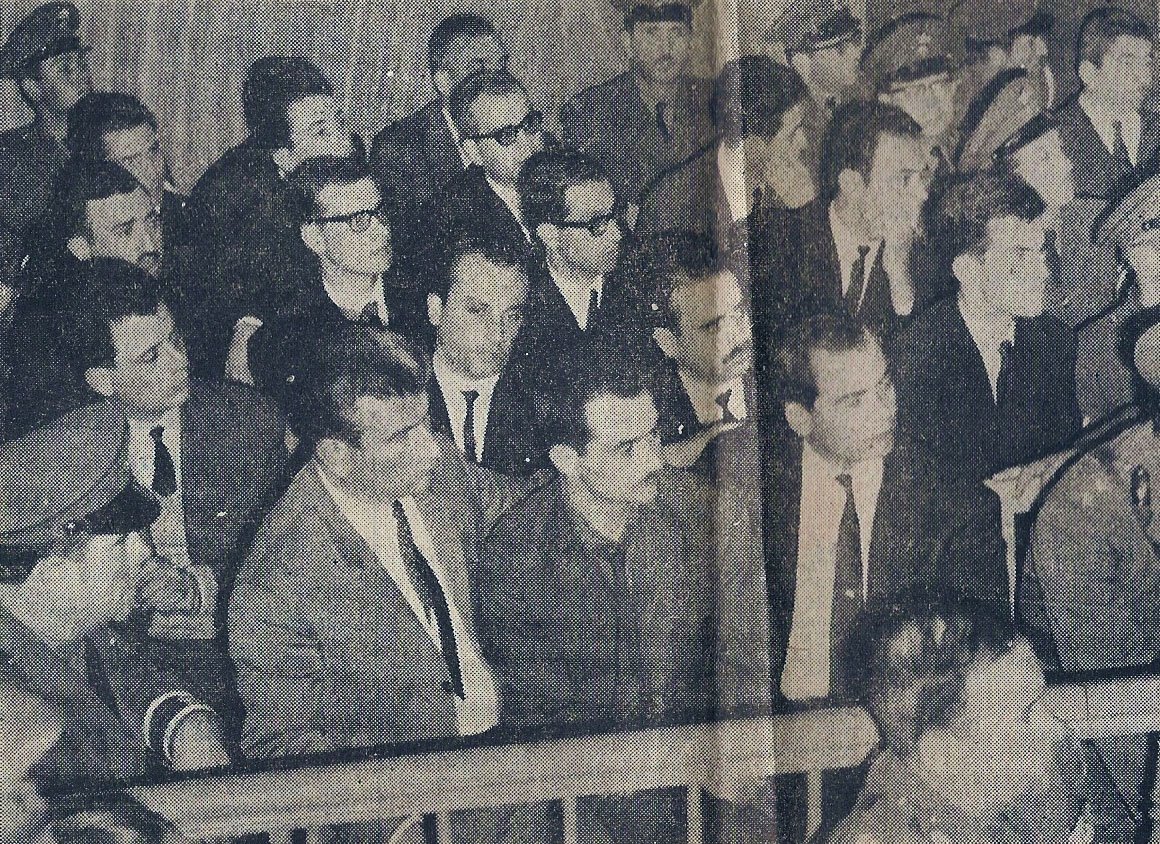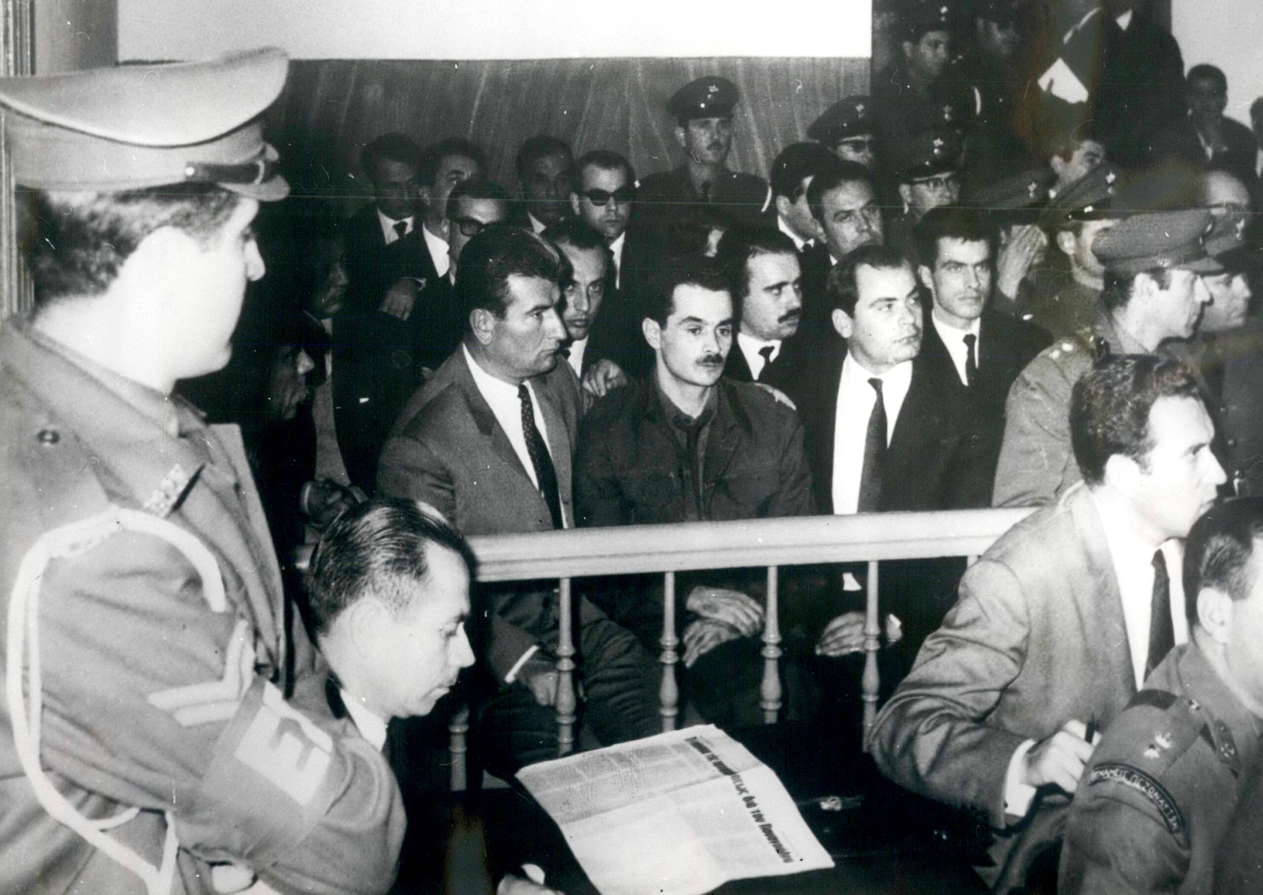 Ο Αλέκος Παναγούλης και οι υπόλοιποι 14 κατηγορούμενοι για την απόπειρα δολοφονίας του δικτάτορα Γεώργιου Παπαδόπουλου, κατά τη διάρκεια της δίκης τους στο Έκτακτο Στρατοδικείο Αθηνών τον Νοέμβριο του 1968. KEYSTONE/ZUMA PRESS/VISUALHELLAS.GR