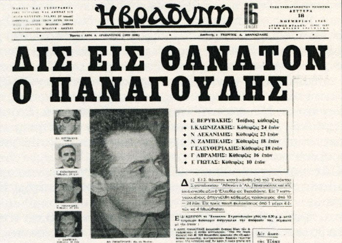 «Δραματική η προχθεσινή συνεδρίασις του Εκτάκτου Στρατοδικείου Αθηνών καθ' ην ο Βασιλικός Επίτροπος, Εισαγγελεύς κ. Ιω. Λιαππής, επρότεινεν να καταδικασθούν εις θάνατον δις ο Αλ. Παναγούλης και άπαξ ο δικηγόρος Ελ. Βερυβάκης. Εις ισόβιον κάθειρξιν ο πολιτικός μηχανικός Κλωνιζάκης και ο Λεκανίδης. Οι λοιποί 10 εις ποινάς καθείρξεως ως και φυλακίσεως, από 2 ετών και άνω. Την απαλλαγήν λόγω αμφιβολιών του Τιμογιαννάκη και την αθώωσιν του Αναστασόπουλου.