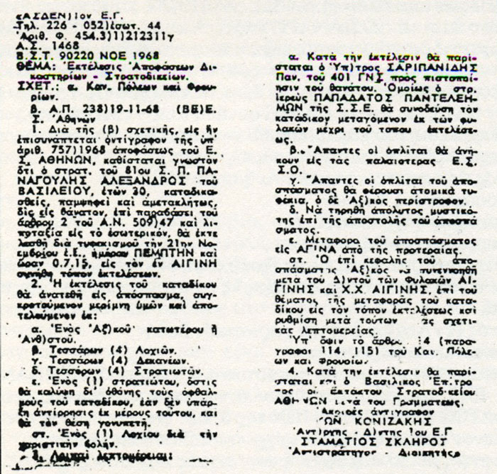 1. Διά της (β) σχετικής, εις ην επισυνάπτεται αντίγραφον της υπ' αριθ.757)1968 αποφάσεως του Ε.Σ. ΑΘΗΝΩΝ, καθίσταται γνωστόν ότι ο στρατ. του 81ου Σ. Π. ΠΑΝΑΓΟΥΛΗΣ ΑΛΕΞΑΝΔΡΟΣ του ΒΑΣΙΛΕΙΟΥ, ετών 30, καταδικασθείς, παμψηφεί και αμετακλήτως, δις εις θάνατων, επί παραβάσει του άρθρου 2 του Α.Ν. 509)47 και λιποταξία εις το εσωτερικόν, θα εκτελεσθή διά τυφεκισμού την 21ην Νοεμβρίου ε.ε. ημέραν ΠΕΜΠΤΗΝ και ώραν 07.15, εις τον εν ΑΙΓΙΝΗ συνήθη τόπον εκτελέσεων.